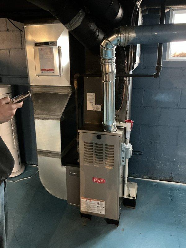 Successfully installed a Bryant gas furnace in the basement utility area, including proper connection of all ductwork components with the large silver air return duct on the left side and round metal ductwork extending from the top unit. System was mounted securely against concrete block wall with all manufacturer specifications followed to ensure optimal performance and efficiency.